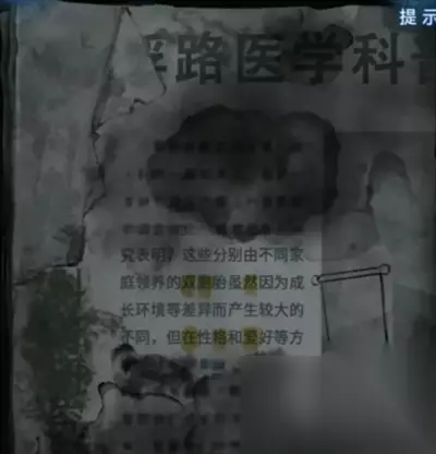 查看右边办公室的门,用【医用钳】开门,注意天花板小高能,开门进入办公室,查看左边的墙上挂上两面【锦旗】,但是还需要调整位置,查看右边墙上贴的纸条,重点是几个标了黄色的字,记下来【双胞然】【在格爱】。