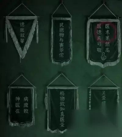 再查看一下锦旗,调整到对应第一行是【双胞然】第二行是【在格爱】,只要有这几个字就行不在乎位置的,调整完毕如下图,注意停尸柜打开小高能,从打开的柜门里拿到【三炷香】,然后按照里面伸出的手指的位置挨个点,顺序为【2-1】【3-3】【1-3】,打开【1-3】之后就能拿到一个布娃娃了,可以下楼了。