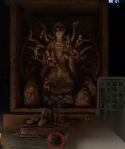 查看左边的楼梯间太黑了上不去,远处有个送子娘娘,查看一下右边的介绍,提示是需要【画下画像并且上三炷香】,我们大概是要找纸笔和香的,查看一下右边关着的门,门是5位数密码,调整为【58339】果然开门,进入。