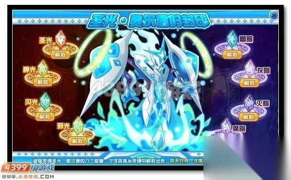 进入新的活动页面后,你会看到圣光·奥尔德的8个封印:圣光、神光、闪光、邪光、幽暗、灰暗、灭暗、魔暗。每个封印都具有不同的特性和系别。每天你都有一次挑战的机会,如果你成功地完成了挑战,你将有资格继续下一轮的挑战。