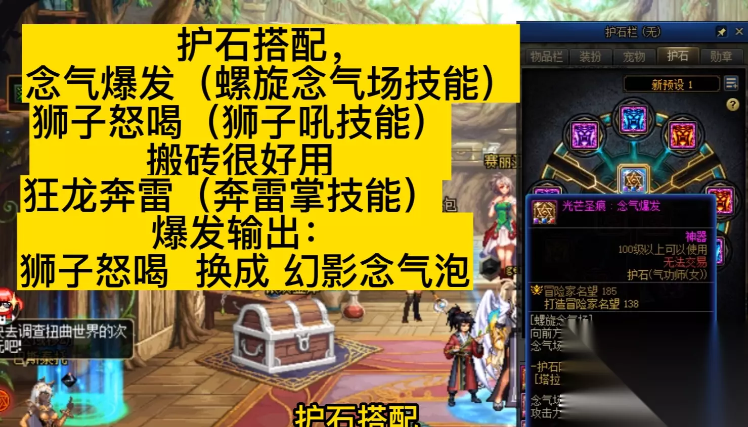 追求爆发的就把狮子怒喝更换为幻影念气泡,九个念气泡符文 最后是女气功的一些打造信息 有什么不足之处欢迎留言 点赞+关注下期见