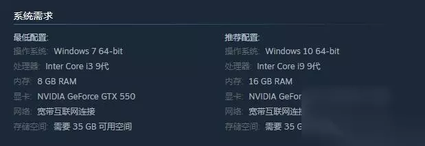 2,接着往下滑动就可以发现这款游戏的配置要求,为最低配置,操作系统: Windows 7 64-bit,处理器: Inter Core i3 9代,内存: 8 GB RAM,显卡: NVIDIA GeForce GTX 550,网络: 宽带互联网连接,存储空间: 需要 35 GB 可用空间。推荐配置,操作系统: Windows 10 64-bit,处理器: Inter Core i9 9代,内存: 16 GB RAM,显卡: NVIDIA GeForce GTX 1080/RTX 2060,网络: 宽带互联网连接,存储空间: 需要 35 GB 可用空间。