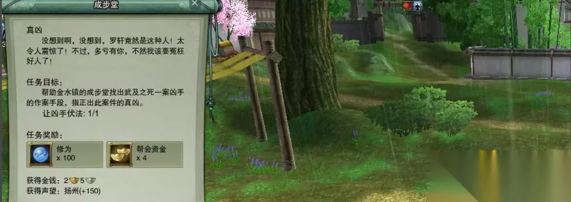 找出真凶任务是剑三探案系列任务中的一个,地点在金水镇,其前置任务是【猝死?他杀?】,任务等级是28级,接任务NPC和交任务NPC都是捕头成步堂,任务类别主要是对话型,不需要杀怪什么的 1、先完成【猝死?他杀?】的前置任务,然后找到成步堂,接【真凶】任务。 2、跟NPC武晖对话获得证词。罗轩曾经跑回房子和武晖的爹说过话,后来带着一群人去了贡橘林,他爹就待在房里,第二天就死了。