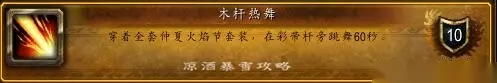 角色之一次去敌对主城亵渎篝火,会自动接到任务,敌对四个基础主城都可以触发,四个主城都亵渎且完成任务即可获得该成就。 木杆热舞:穿着一套火焰节套装,在彩带杆旁边跳舞60秒。