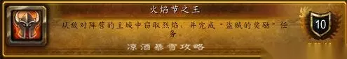 头盔、肩膀、衣服、鞋都是节日限定的,只能在火焰节幻化。 火焰节成就 大部分火焰节成就都是祭拜某处的篝火、亵渎某处的篝火,比如祭拜潘达利亚的所有篝火、亵渎诺森德的所有篝火等,这种成就就不多说了。 除了祭拜和亵渎之外,还有这4个成就: 火焰节之王:窃取敌对主城的篝火,并完成“盗贼的奖励”任务。