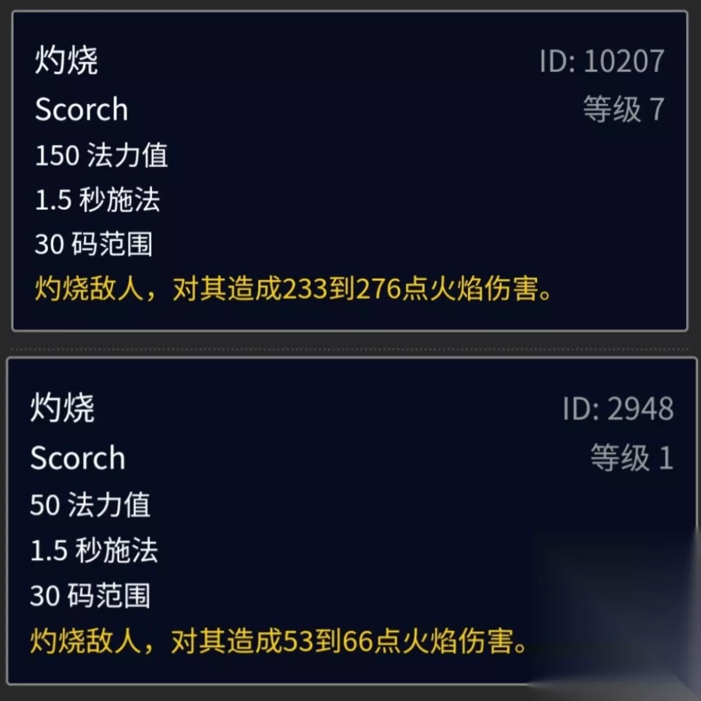 当然,要是短时间的战斗就不要考虑这么多,照着BOSS脸上糊12级火球术就好了。 灼热应该使用1级的 灼热这个技能是拿来干嘛的呢? 是拿来叠火焰易伤的,一共5层,每层可以提供3%的火焰易伤。 那么为什么要使用1级的灼烧来进行DEBUFF填充呢?还是因为控蓝的需求,灼烧从1级到7级都是享受同样的法伤加成,但是7级灼烧比1级灼烧多用了100点蓝,只多了181~211点伤害,这个法力利用率非常的低,省下来的蓝拿来打更多的12级火球术更划算。对于法爷来说,只要你的法伤超过500,都该用1级的灼烧来进行DEBUFF填充。