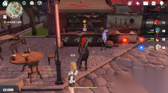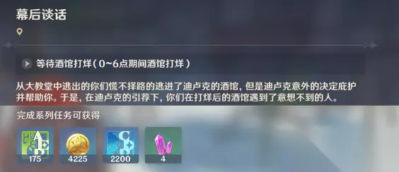 24、离开酒馆 25、等待酒馆打炸(0~6点期间酒馆打炸):需要再次调整游戏时间。 26、回到酒馆 27、与迪卢克对话 【追逐暗影】 28、进入愚人众的藏身地:以后遇到的任务会有许多类似的临时副本秘境入口。特别需要注意:这些临时秘境中的宝箱只能拿一次,任务中没能拿到宝箱的话,后续就无法再次获得了。
