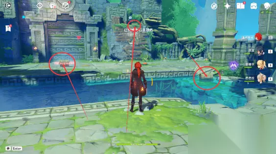 ②普通*3,水里一个,右高处丘丘人身后一个,击败左右高处的丘丘人后解锁中间这个,同时开启前往下个区域的大门。