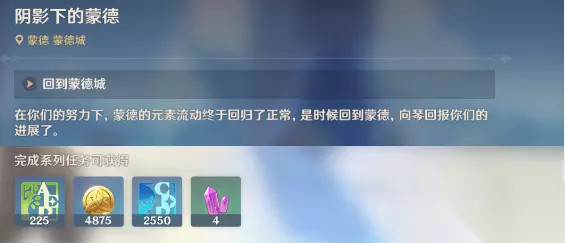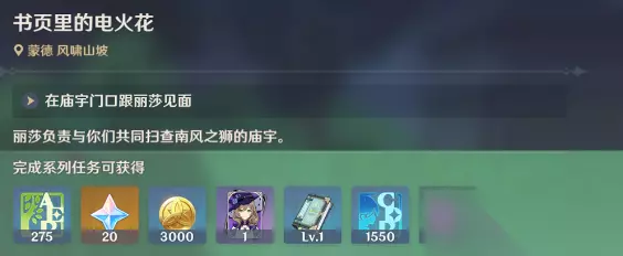 21、与派蒙对话(对话完成后,回收关键任务道具[赤色的结晶]。 【随风而来的骑士】 22、继续前往蒙德城 23、与轻盈的少女骑士对话