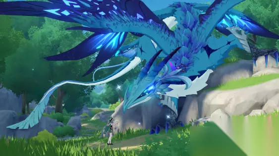 【林间相会】 17、前往蒙德(跟随左上角地图提示前进,期间可以看到风魔龙从头顶飞过) 18、向树林的深处前进(来到任务指引处附近会触发一段动画剧情)