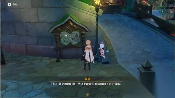 3、查看公告牌上面的谜语,提示在白昼的时候从桥上能看见灯塔下的背影。