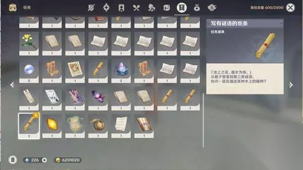21、在背包中查看纸条,获得新的池上之花,盛水为珠谜语。