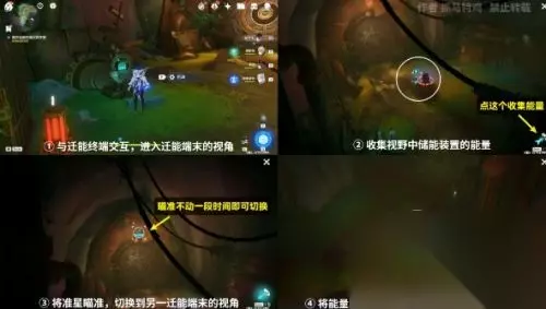通往奇点之路任务流程攻略 (1)探索神秘建筑 (2)与被困的人对话 (3)操作迁能终端打开牢笼 ① 与迁能终端交互,进入迁能端末的视角 ② 收集视野中储能装置的能量 ③ 将准星瞄准,切换到另一迁能端末的视角 ④ 将能量发射到牢笼面前的储能装置,牢笼解锁 ⑤ 打开牢笼