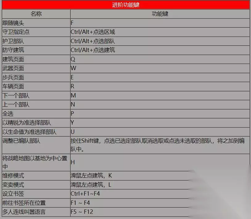 以下是进阶快捷键,成为红警高手玩家必需掌握的技能: