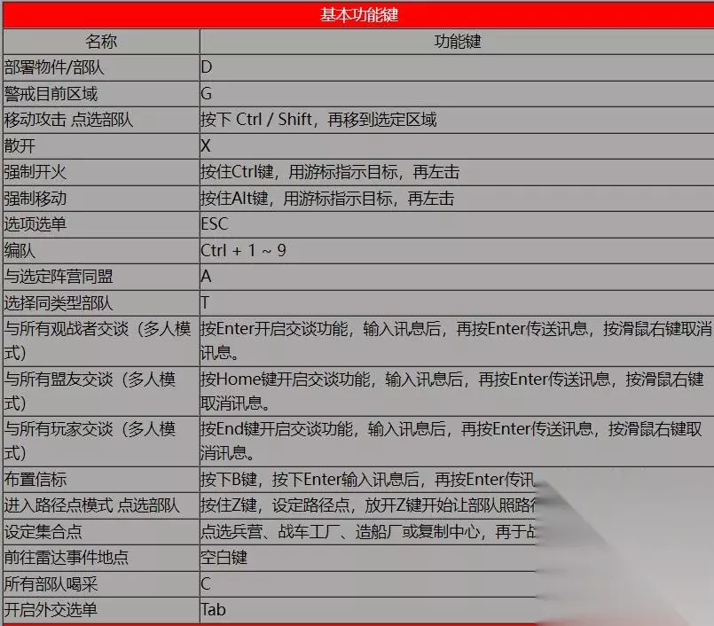 红警2快捷键一览表 以下是基础快捷键,适合新手和普通玩家使用,可以适当提升游戏效率: