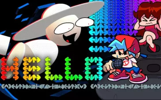 这是《Friday Night Funkin'》(周五夜放克)的伟人模组相关内容,关联曼德拉记录,是带有恐怖画面的音游玩法内容,操作界面显示方向按键,还有角色对战画面,心脏患者和精神创伤者需谨慎观看。