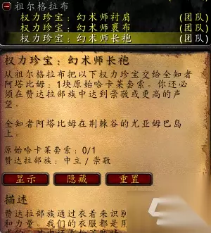 还有一组职业套装的任务,根据玩家职业的不同会在不同的NPC处接到。NPC共有四人,分别为【击碎者金罗克】(战骑套装)、【全知者阿塔比姆】(术法套装)、【盲眼法希尔】(贼猎套装)、【祖达萨的梅维克】(牧萨套装),他们都在这座小岛上,不难找。 找到对应职业的NPC后,他会给你三个【权力珍宝】任务,分别对应获取祖格职业套装中除了饰品和项链的其余三件(肩膀手腕胸甲腰带四个位置中的三个,根据职业有所不同)。任务需要我们去祖格中杀死各个BOSS,获取他们掉落的任务道具【原始哈卡莱XX】,得到自己对应职业的任务道具后,回去和对应NPC对话即可获得祖格职业套装。 此外,兑换套装除了需要道具,还有声望要求,只有声望达到崇敬,才能三件全部换到。 顺便一提,职业套装的项链也是在这四个NPC处获得,声望达到友善后可以在他们这里领到最低级的项链,随着声望提高,可以在他们这里给项链升级,达到最高等级需要赞达拉声望达到崇拜才行。 以上就是魔兽世界怀旧服ZUG任务交接位置介绍,希望对各位玩家有所帮助!