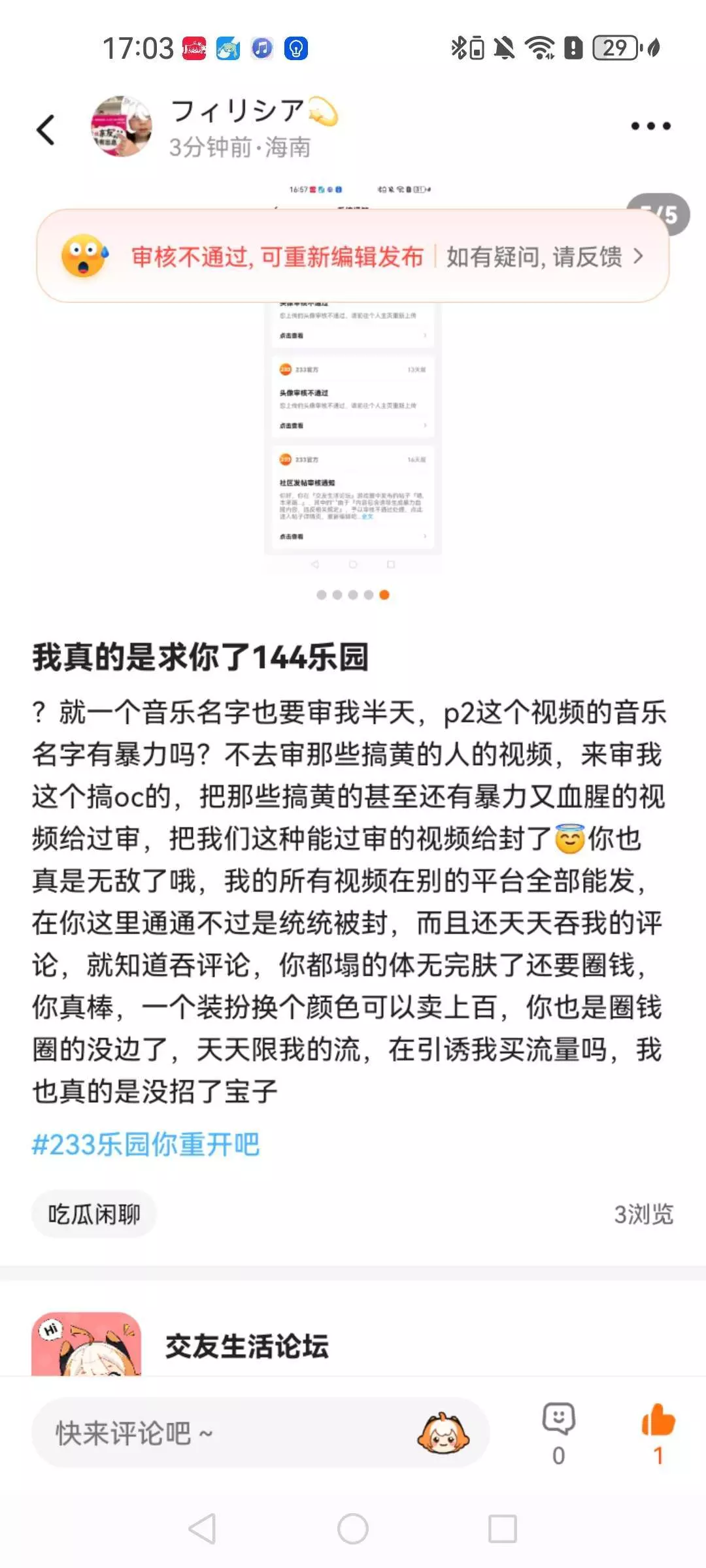 ?就一个音乐名字也要审我半天,p2这个视频的音乐名字有暴力吗?不去审那些搞黄的人的视频,来审我这个搞oc的,把那些搞黄的甚至还有暴力又血腥的视频给过审,把我们这种能过审的视频给封了😇你也真是无敌了哦,我的所有视频在别的平台全部能发,在你这里通通不过是统统被封,而且还天天吞我的评论,就知道吞评论,你都塌的体无完肤了还要圈钱,你真棒,一个装扮换个颜色可以卖上百,你也是圈钱圈的没边了,天天限我的流,在引诱我买流量吗,我也真的是没招了宝子