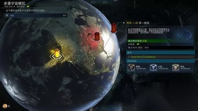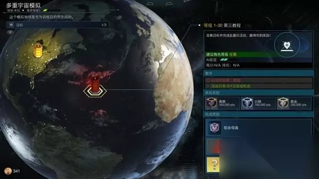 你会看到地球表面出现的六棱柱,这些就是面临的危机。 点击可以看到该危机所需的角色等级最低需求、ai难度以及挑战该危机的其它玩家高分/排名情况(需在线)。 危机任务还会提供奖励,可以直接查询(图中就是根据完成得分获得不同等级的宝箱)。