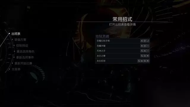 此外,你还可以按ESC查看出招表以及调整比赛、事件和装备等。 在练习模式选择角色查看出招表,可以让你详细的了解角色的打法。