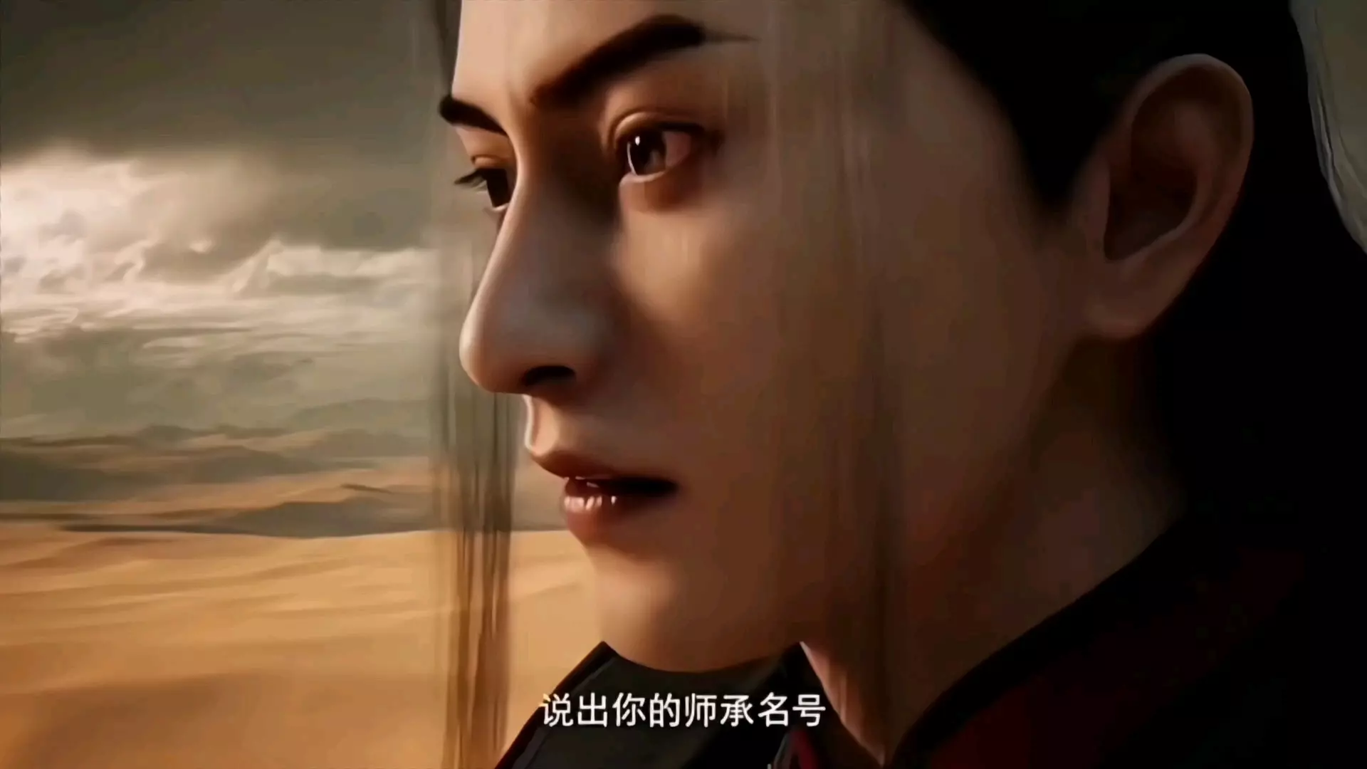 这是动画《凡人修仙传》的相关内容,呈现了沙漠场景里的对峙情节,王蝉要求对方报出师承名号,韩立以“黄枫谷 无名之辈”回应,展现了角色间的交锋。