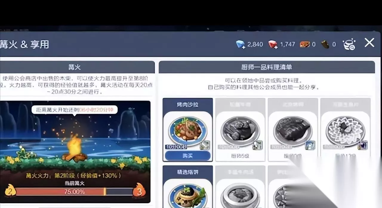 我们可以选择购买三个或五个篝火材料,这取决于我们的需求和公会的活跃度。购买这些材料后,我们可以在公会中点燃篝火,这将为我们提供额外的游戏经验和其他奖励,有助于我们更快地提升等级和获得更多的游戏资源。