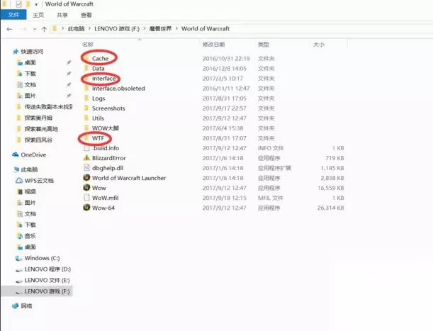4、把WOW文件夹里的Interfance Cache WTF三个文件夹里的东西全删除了试下。