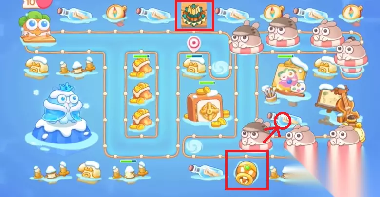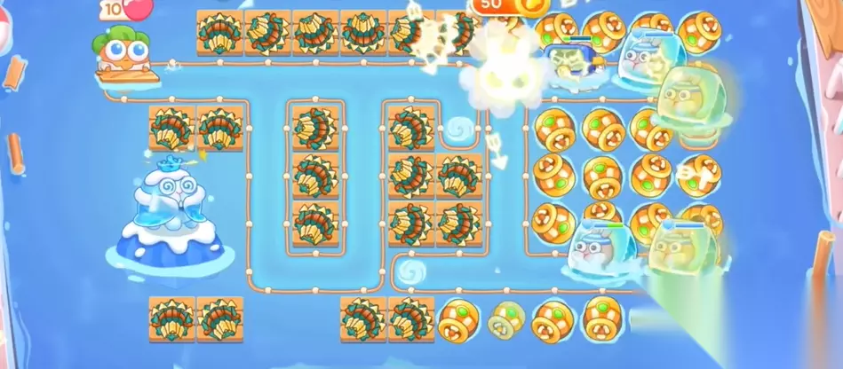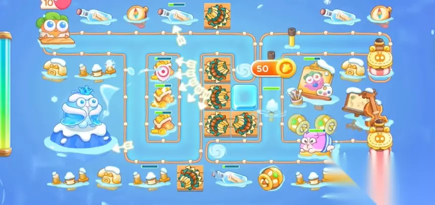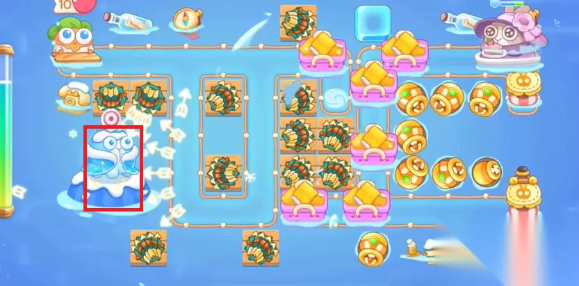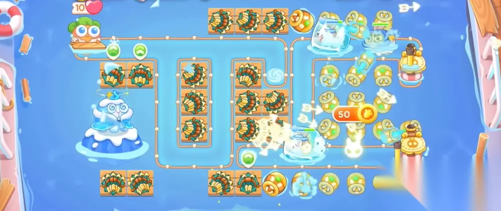 2、开局首先在上面的地方放分裂箭,下面放鱼类,优先将图中的漂流瓶给打掉,种上鱼雷。