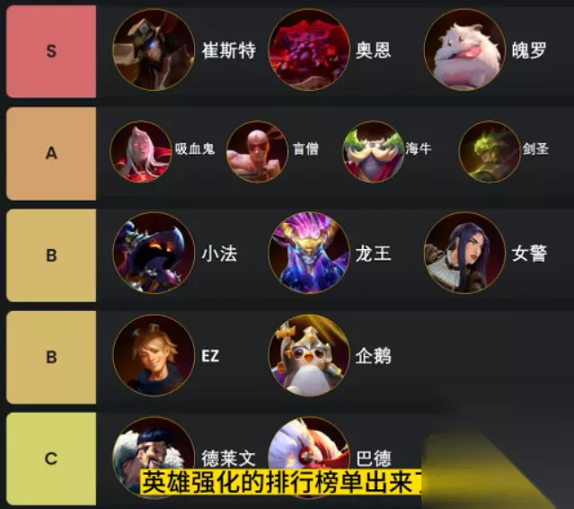 云顶之弈S9英雄之力哪个英雄厉害? 云顶之弈S9英雄之力胜率排行榜: 一、强度排行 【T0】崔斯特、奥恩、魄罗 【T1】吸血鬼、盲僧、海牛、剑圣 【T2】小法、龙王、女警 【T3】EZ、企鹅 【T4】德莱文、巴德、塔姆