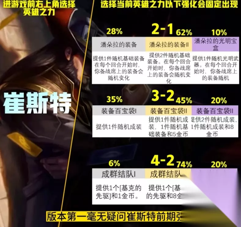 二、强度解读 【卡牌】 版本第一毫无疑问崔斯特,前期强势,而且全局完美神装,后期多旗子也是枪手/盖伦等诸多玩法的最佳搭配。此外也有多传送门、多灵风的玩法。