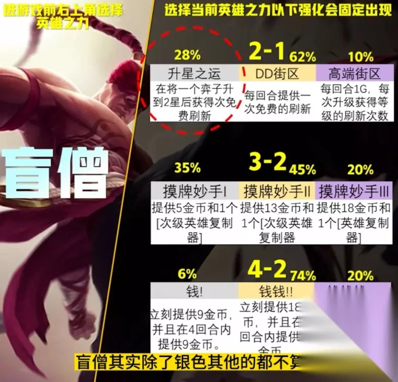 【吸血鬼】 A级最高的是吸血鬼,不过吸血鬼目前看来被砍太多了,后续榜单可能会被下调。 【盲僧】 盲僧其实除了银色【升星之运】外其他的都不算强,但是架不住这个赛季赌狗强。