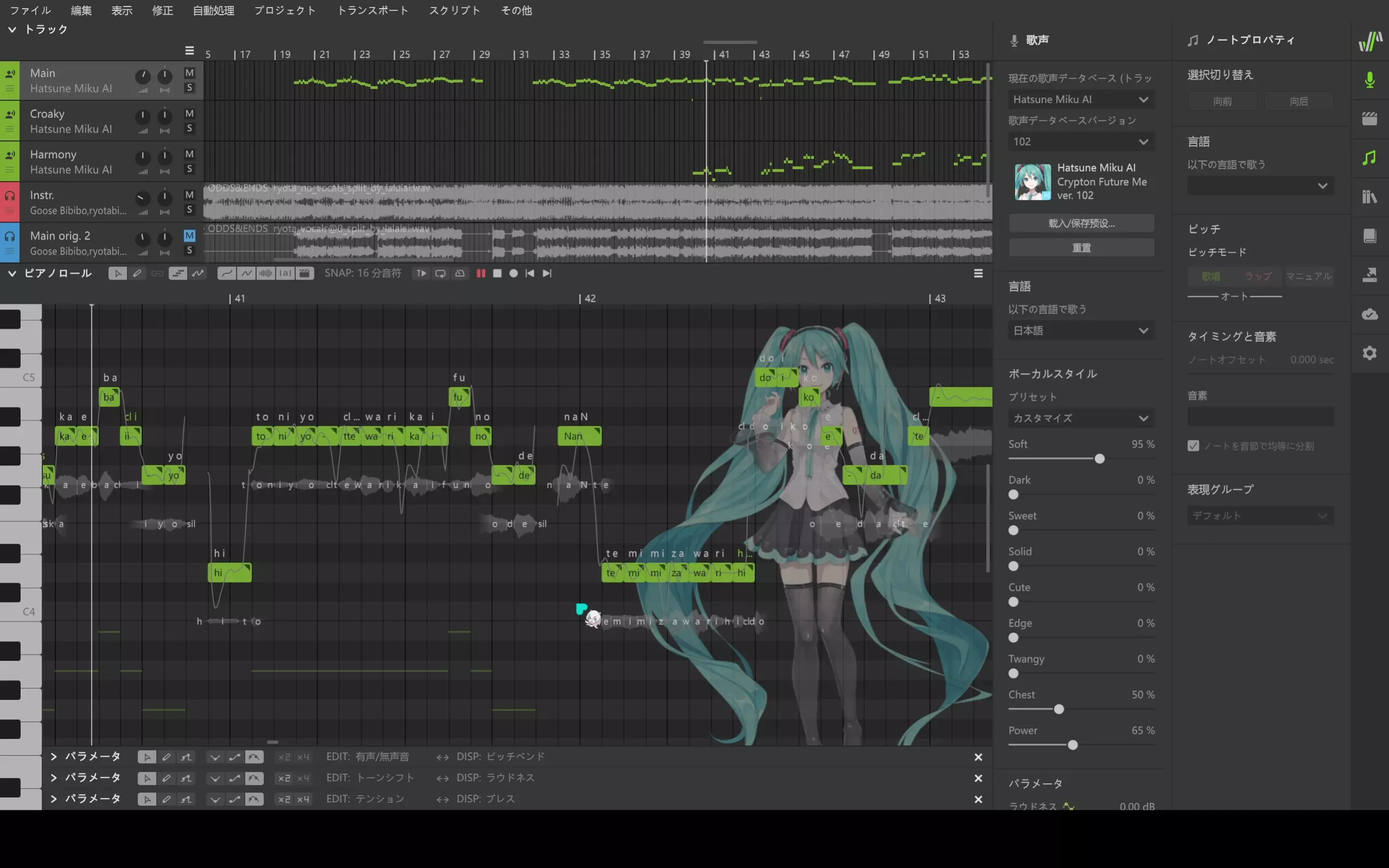 这是一则使用VOCALOID软件制作的初音未来相关音乐内容,展示了软件内的音轨、参数编辑界面,呈现对初音未来V4中文声库的调音制作过程,打造相关音乐作品。