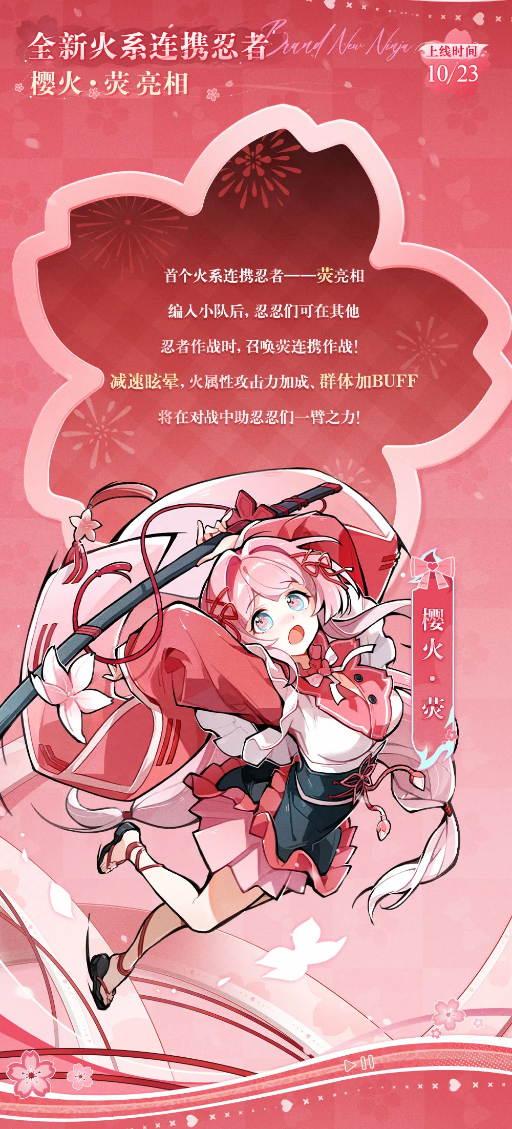 花火强控,群体加成——作为首位火系连携忍者,「樱火·荧」具备优秀的火属性攻击加成能力。当「樱火·荧」作为连携忍者配合火属性忍者进行作战时,连携技能将会为其附加更高的额外伤害。在多人战斗模式下,连携技能释放后将会进行群体攻击加成;而当作用对象为「双焰·小椒」时,加成效果则会更为显著!
