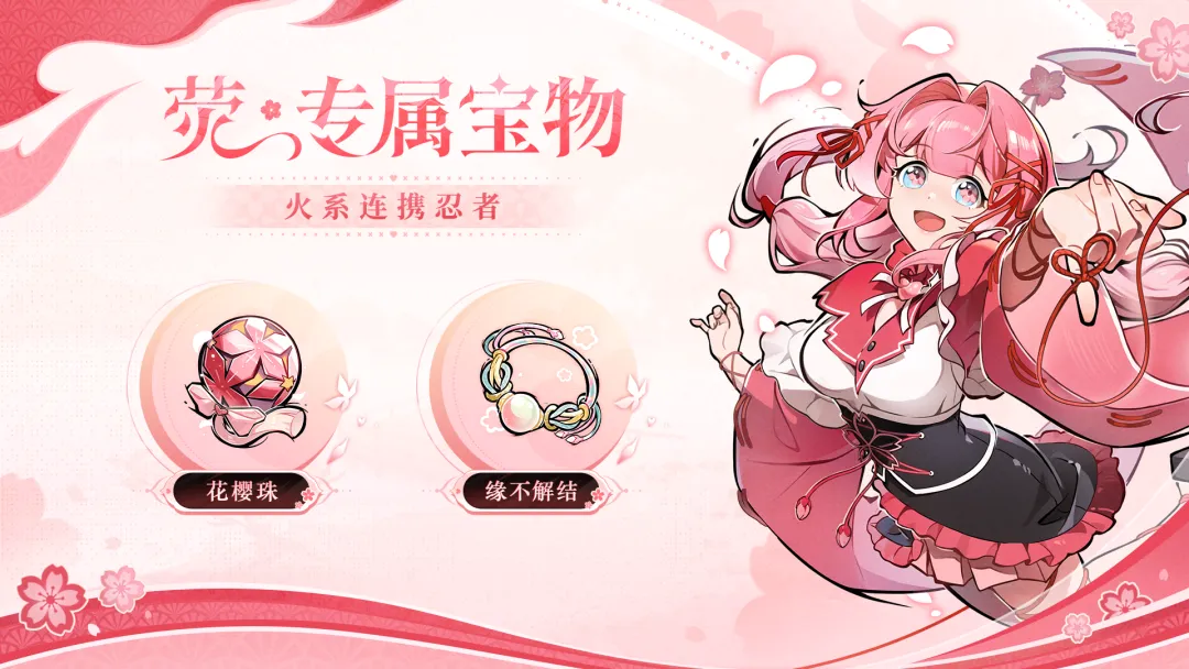 两件宝物共同组成了【樱火套装】,当「樱火·荧」对其进行携带时,可减少连携技能的冷却时间,同时还会增加连携技对敌人产生的眩晕时间。