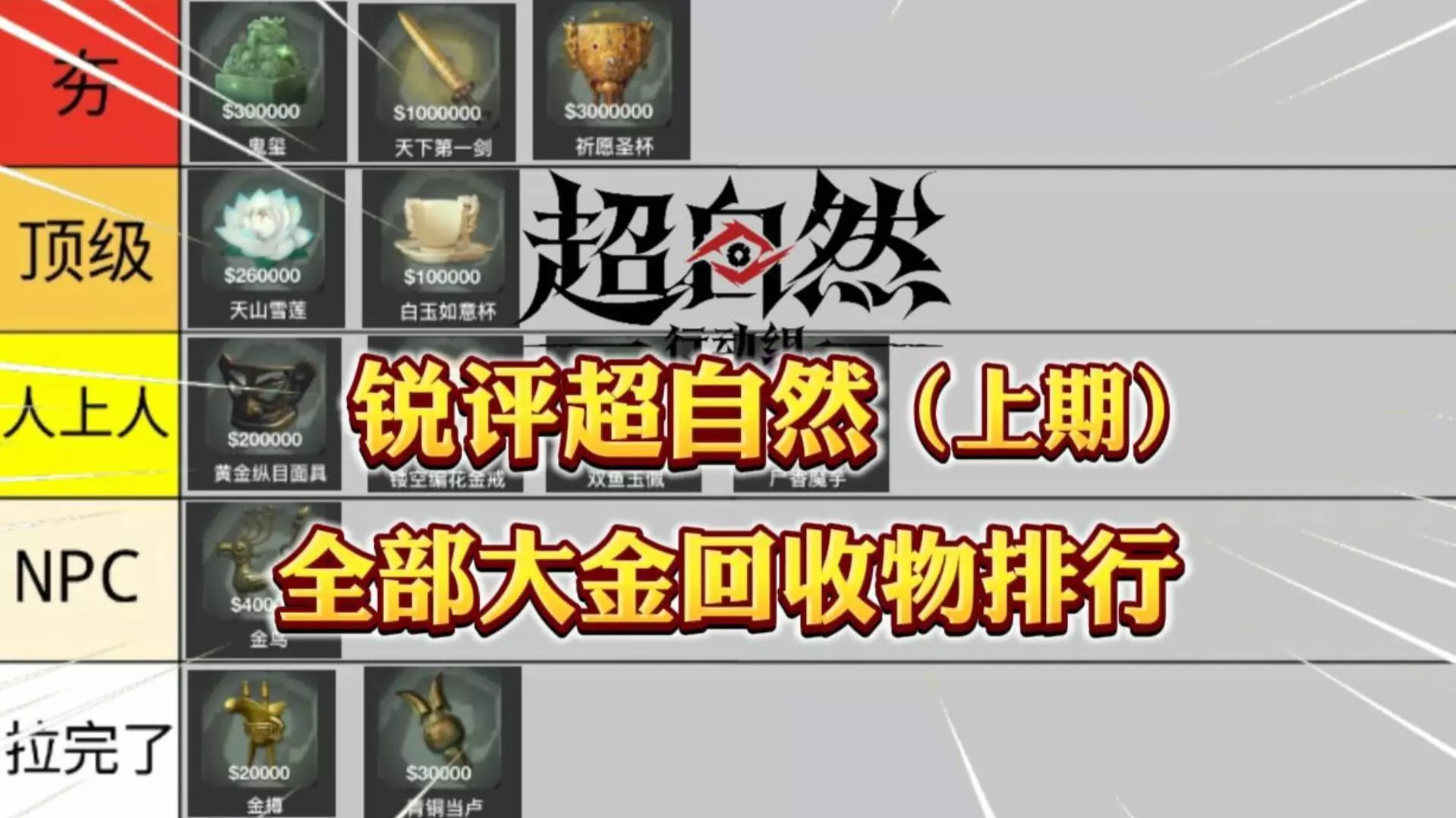这是《超自然行动组》大金回收物锐评下期内容,将全部大金回收物分为夯、顶级、人上人、NPC、拉完了五个级别,介绍了鬼玺、天下第一剑等不同大金的价值与评级,帮助玩家了解大金回收物的梯队。