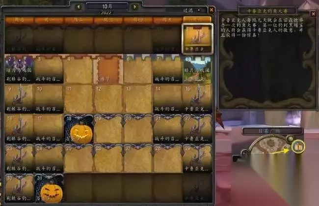 巫妖王之怒版本加入的日历功能,能让我们直观的了解钓鱼大赛的时间与要求,点击小地图右上角的日历查看,如下图所示(箭头指向黄圈处)