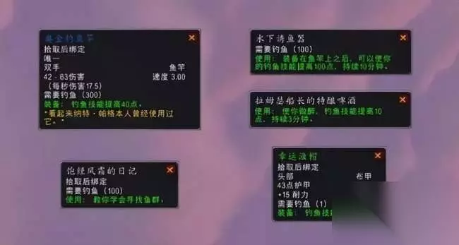 为了赢得钓鱼大赛的胜利,我们需要做好充足的准备,小编这里总结了四项,供大家参考: 1.将钓鱼技能练到满级(450); 2.准备增加钓鱼技能的物品,例如鱼竿、鱼饵、装备、烹饪等; 3.学会“寻找渔点”(饱经风霜的日记)、学会寒冷天气飞行; 4.将炉石绑在达拉然。