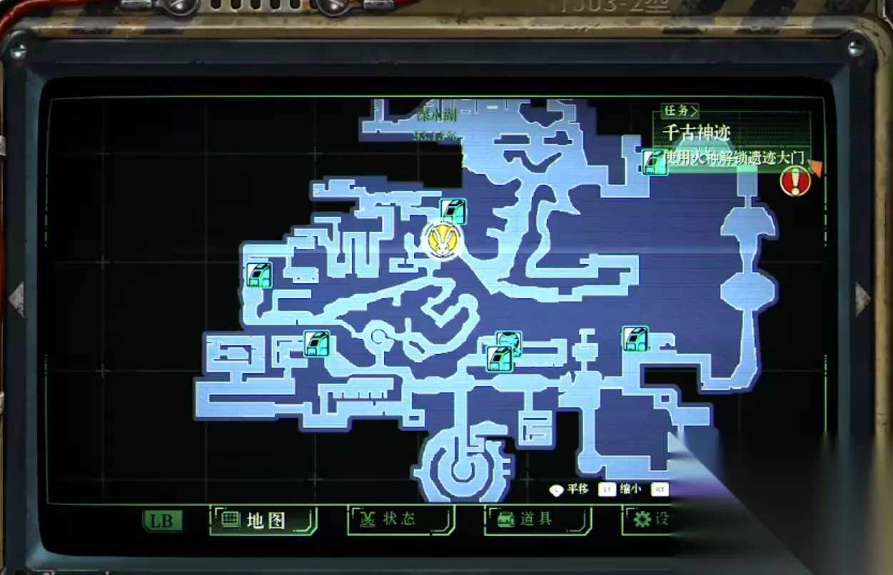首先有黄色双层门的地方处在图示的深水湖地区,这个地方需要玩家有这个胡萝卜一样的钻头才能顺利前往,这里在水下移动的频率非常的高,所以这个能够产生螺旋气流的钻头可以说是非常的重要,比如遇到水下的涡流的时候可以直接冲刺攻击过去。