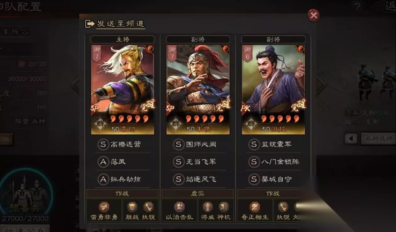 群弓阵容的核心战法搭配主要围绕SP袁绍、SP朱俊和沮授展开,强调控制链与持续输出的结合。SP袁绍作为主将通常携带威谋糜亢、掣刀斫敌或横扫千军等战法,这些战法能在前期快速建立压制优势,配合自带战法高橹连营的缴械效果,形成稳定的先手控制。SP朱俊则优先选择无当飞军和焰逐风飞,前者提供稳定的指挥伤害,后者补充震慑控制,两者结合能有效穿透敌方防御。沮授的核心作用是延长负面状态,因此八门金锁阵和刮骨疗毒是标配,前者提供减伤和先攻,后者确保队伍续航。