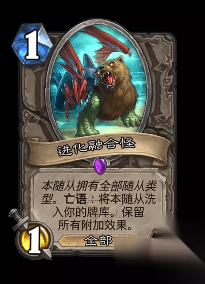 胜地历险记的中立史诗随从。本随从拥有全部随从类型。(亡灵,鱼人,恶魔,机械,元素,野兽,海盗,龙,野猪人,纳迦,图腾,德莱尼)。亡语:将本随从洗入你的牌库。保留所有附加效果。