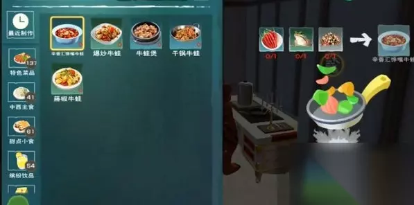 在《创造与魔法》中,牛蛙可以用于制作以下几种食物:爆炒牛蛙:所需材料:青椒、洋葱、牛蛙。食物效果:食用后增加70食物。辛香汇水煮牛蛙:所需材料:朝天椒、胡椒、牛蛙。食物效果:食用后增加105食物,并获得一级御寒buff。藤椒牛蛙:所需材料:胡椒、柠檬、牛蛙。食物效果:食用后增加70食物。牛蛙煲:所需材料:洋葱、竹笋、牛蛙。食物效果:食用后增加105食物,并获得一级耐力buff。干锅牛蛙:所需材料:土豆、竹笋、牛蛙。食物效果:食用后增加105食物,并获得一级耐力buff。