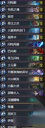 显然,我们属于后者,我们自己利用自己的图腾来进行BUFF,不会出现没有随从可以BUFF的尴尬境地。 打法思路: 打法思路简化,分为两个点来简述: 1、前期我们应该多利用法术和武器来控制场面。解场要省着用,如果对面的场功不高或者没有威胁性大的随从,我们就忍,等他多铺场我们在使用AOE,尽可能的打卡差。 2、当我们渡过前期,就要开始进入自己的节奏了:进攻。按照上述说的Combo进行铺场,利用随从的压制力来扳回前期的劣势。 总结:浓缩就是精华 单卡替换: 推荐换两张卡,第一张就是升腾者、第二张是伊瑟拉。都有的小伙们就不要换了,这里我是对非洲的小伙们说的。 升腾者:这是一张防御卡,不是进攻卡。