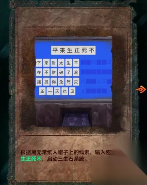 接着,点击音乐台前左边的三生石,刷杜言她的钥匙卡,根据线索得出答案为“平来生正死不”。这个过程充满了神秘与挑战,玩家需要仔细观察线索,运用逻辑推理来解开密码,进一步探索游戏中的神秘世界。