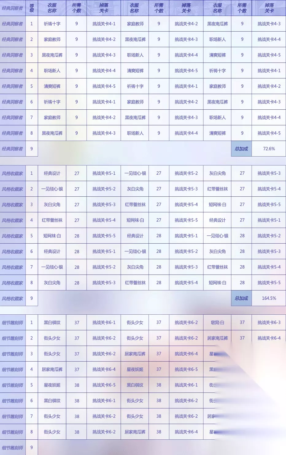 闪耀暖暖在搭配学院升级各项课程是提升搭配评分的重要方式,那么搭配学院传奇设计师的诞生升级需要哪些材料?升到满级一共可以获得多少得分加成?还不知道的小伙伴就来看看下面233乐园小编整理带来的解答吧: 传奇设计师的诞生升级材料一览~所需材料是抛去已经拥有的一件 分为三阶经典洞察者、风格收藏家、细节雕刻师,每个阶级9档 主要消耗的材料部件如图: