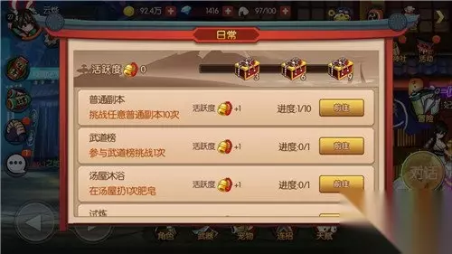 日常任务则是每天都有的,而且内容都差不多,实时竞技、日常购物、试炼、招财进宝等等,大致就是每天的活跃任务,完成任务数有活跃度,活跃度达到一定要求可以开启活跃宝箱,获得道具奖励。