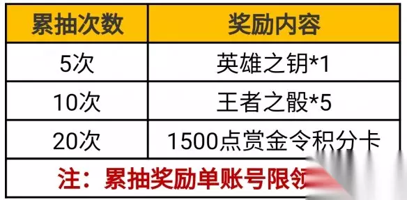 累抽奖励 活动中设有累抽奖励,大家在活动期间累计抽奖达到指定次数即可领取相应的奖励,每项奖励单账号限领1次,这点大家应该都非常熟悉。