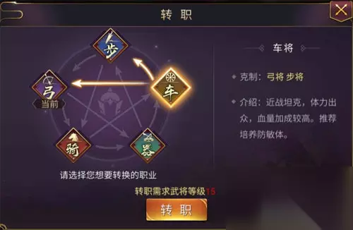 1、步将 克制:骑将、弓将 介绍:进展坦克,防御出众,伤害减免较高。推荐培养防敏体。 2、弓将 克制:骑将、器将 介绍:远程输出,敏捷出众,命中、暴击高。推荐培养攻敏体。 3、骑将 克制:车将、器将 介绍:进展坦克,敏捷出众,闪避、抗暴高。推荐培养防敏体。 4、器将 克制:步将、车将 介绍:远程输出,攻击出众,伤害较高。推荐培养攻敏体。 5、车将 克制:弓将、步将 介绍:近战坦克,体力出众,血量加成较高。推荐培养防敏体。