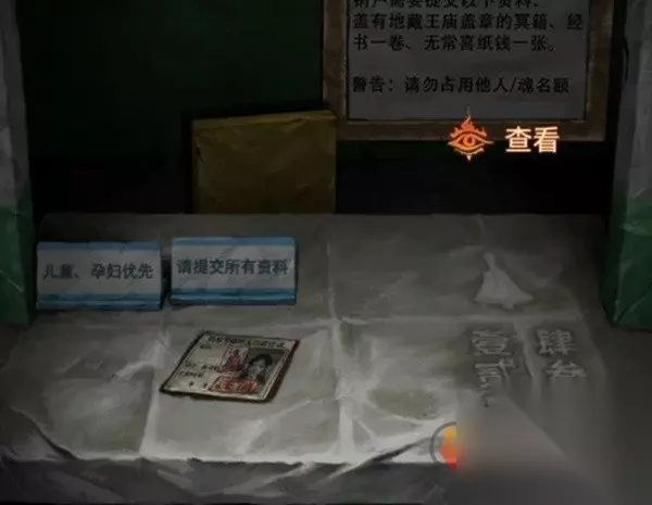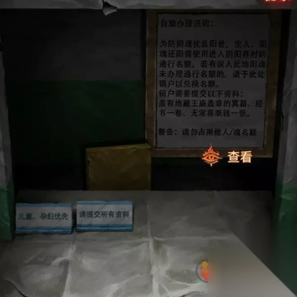 后退出咖啡厅,查看左边的办事处,使用欢迎光临的牌子挡住休息的牌子,果然门开了,进入办事处先查看一下左边的八不郎,牌子说明他是个办假证的,使用二十亿后我们就获得了***,再查看一下右边的窗口,我们需要准备的材料是***、经书、无常喜纸钱,注意证件还需要盖章一会过去。