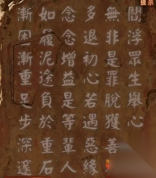剧情后把石片放在左上角的石碑上,开始玩记忆小游戏了,这里给推荐一种作弊方法,拿上上面那张图,发送给自己的qq号,然后使用另一个手机登录qq接收图片,打开随便一个编辑软件,点击开始后跳那个字就在那个字上面写顺序~完成之后石碑裂开,进入就可以找到女主了。