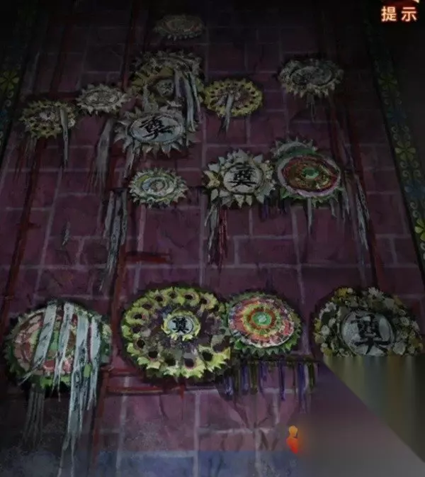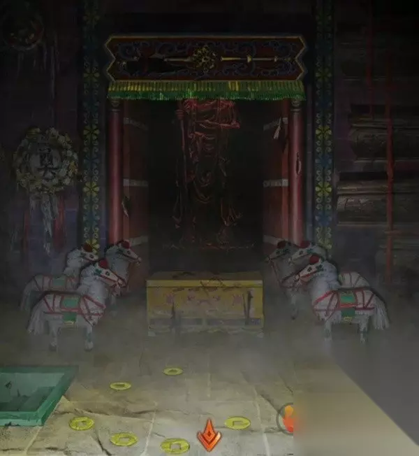 进入宫殿后就看到了马,看来我们的密码又是个多房间数数谜题了,先记下来这个房间有6匹马和7枚纸钱,然后看一下左边的墙上,花圈怎么有点数不清呢,眯起眼来仔细看看,好像也不是非要数得清,这连起来不就是个大写的七一吗,所以花圈代表的数字是71记下来。